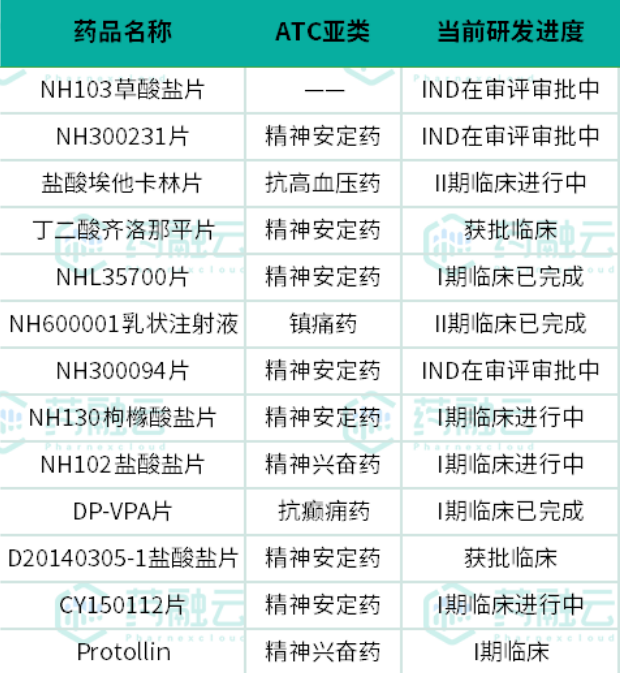 其中,静脉麻醉领域的NH600001乳状注射液针对麻醉诱导和短时手术麻醉的研究已进入临床Ⅱ期阶段。据悉,NH600001乳状注射液是依托咪酯的升级产品,该产品能够改善依托咪酯对肾上腺皮质功能的不利影响,且保存了依托咪酯的优势,能更好地用于中长期麻醉维持、中长期镇静。精神领域的6个研究项目(NH112、NH102、NH130、Protollin鼻喷剂、NHL35700、YH1910-Z02)进入临床I期阶段,另有3个项目预计2023年下半年递交临床申请。