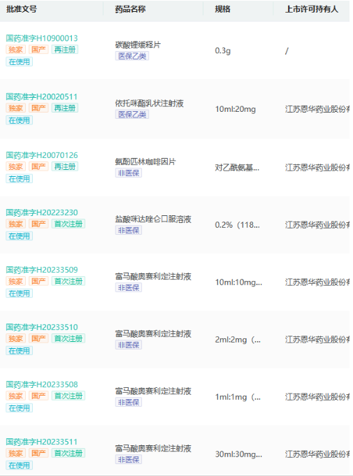至此,恩华药业在神经系统用药领域共有富马酸奥赛利定注射液、盐酸咪达唑仑口服溶液、氨酚匹林咖啡因片、依托咪酯乳状注射液、碳酸锂缓释片等5款独家药品。