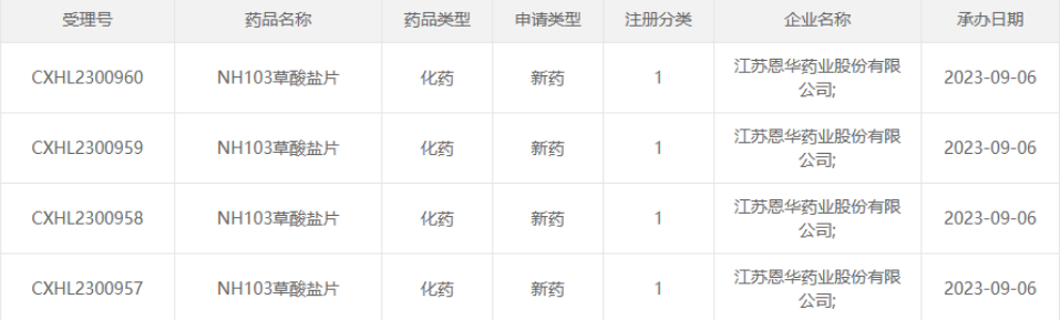 9月6日,恩华药业1类新药NH103草酸盐片4项临床试验申请获CDE受理。这是该品种首次申报临床。至此,恩华药业已有至少13款1类新药迈入IND及以上阶段。