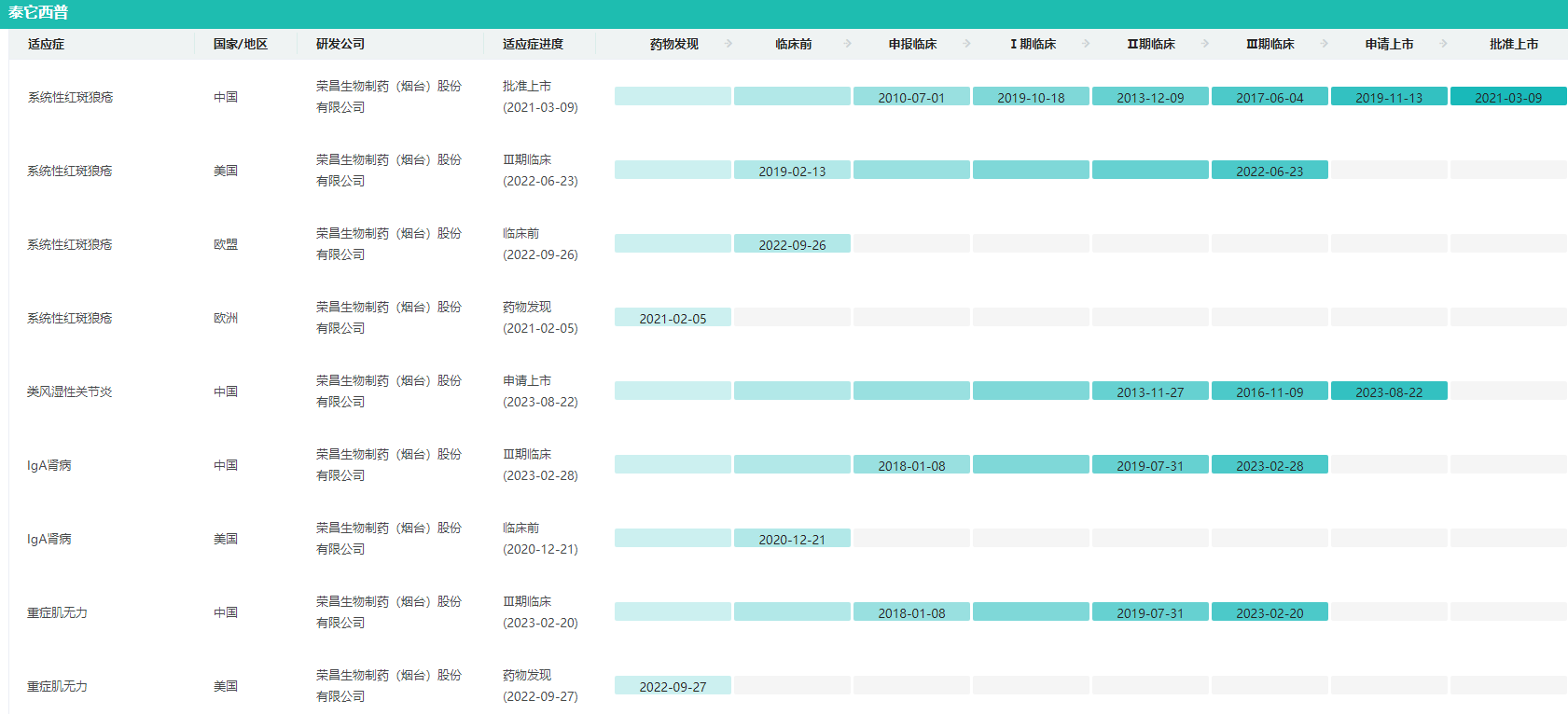 泰它西普在研适应症进度查询(部分)
