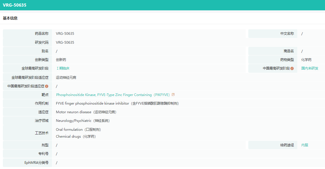 Verge Genomics目前正在开发一种名为“VRG50635”的治疗ALS的药物。VRG50635是一款针对靶点PIKfyve的小分子抑制剂,通过抑制PIKfyve来恢复退化的神经元。PIKfyve是由Verge Genomics AI技术平台ConVERGE™发现的肌萎缩侧索硬化症的新型治疗靶点。2022年,VRG50635进入人体试验阶段,1期试验已于今年6月发布,在安全性和耐受性方面表现出积极结果。