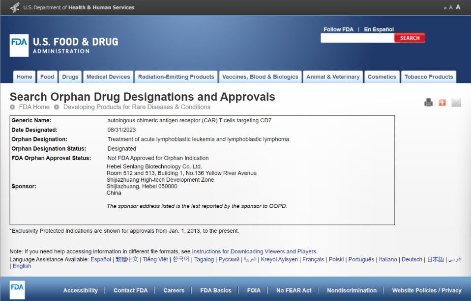 近日,河北森朗生物科技有限公司(以下简称森朗生物)收到美国食品药品监督管理局(FDA)孤儿药开发办公室(OOPD)正式书面回函,其自主研发的靶向CD7的CAR-T细胞产品(SENL101自体T细胞注射液)被授予孤儿药资格认定(ODD),用于治疗成人复发或难治性T淋巴母细胞淋巴瘤/白血病(T-LBL/ALL)。