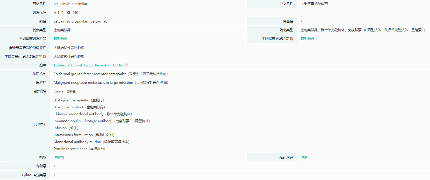 A140注射液是国内首家申报上市的西妥昔单抗注射液,拟用于治疗 RAS 基因野生型的转移性结直肠癌:与 FOLFOX 或 FOLFIRI 方案联合用于一线治疗;与伊立替康联合用于经含伊立替康治疗失败后的患者。同时,拟用于治疗头颈部鳞状细胞癌:与铂类和氟尿嘧啶化疗联合用于一线治疗复发和/或转移性疾病;与放疗联合用于治疗局部晚期疾病。