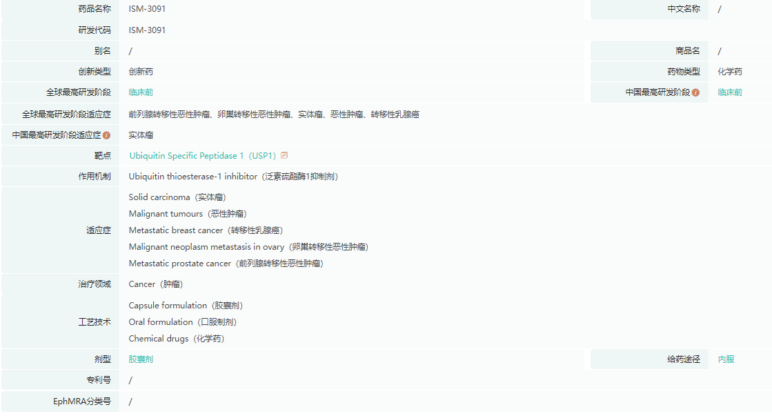 ISM3091是一款口服高选择性USP1小分子抑制剂,由英矽智能自主研发的人工智能平台赋能开发,在 BRCA 基因突变的肿瘤模型中具有强效活性。2023年4月,美国食品药品监督管理局(FDA)批准了英矽智能关于ISM3091在实体瘤患者群体中开展临床试验的新药临床试验申请(IND)。