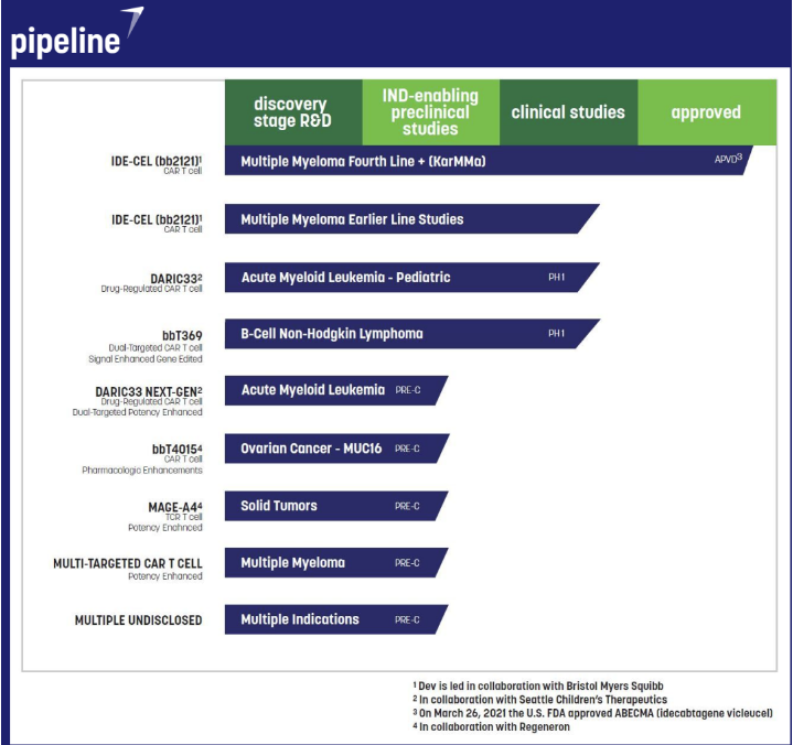2seventy bio于2021年4月26日在美国注册成立。该公司是一家细胞和基因治疗公司,专注于AML(急性髓细胞性白血病)和下一代多发性骨髓瘤策略、B-NHL(B细胞非霍奇金淋巴瘤)和实体瘤策略研究。其产品管线包括靶向CD33的细胞疗法药物SC-DARIC33和bbT369,以及和百事美施贵宝合作的已经获批的靶向BCMA的CART药物Abecma。