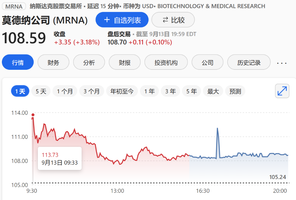 受此消息的影响,Moderna当天开盘后股价一度大涨超过7%。目前市值413.29亿美元。