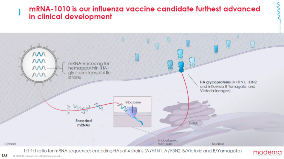 公司在报告中提到,更新剂型版流感疫苗mRNA-1010在一项三期研究中达到所有主要终点。目前,全球范围内都还没有任何一款流感mRNA疫苗获批上市,这为Moderna与监管机构讨论批准该疫苗上市铺平了道路。
