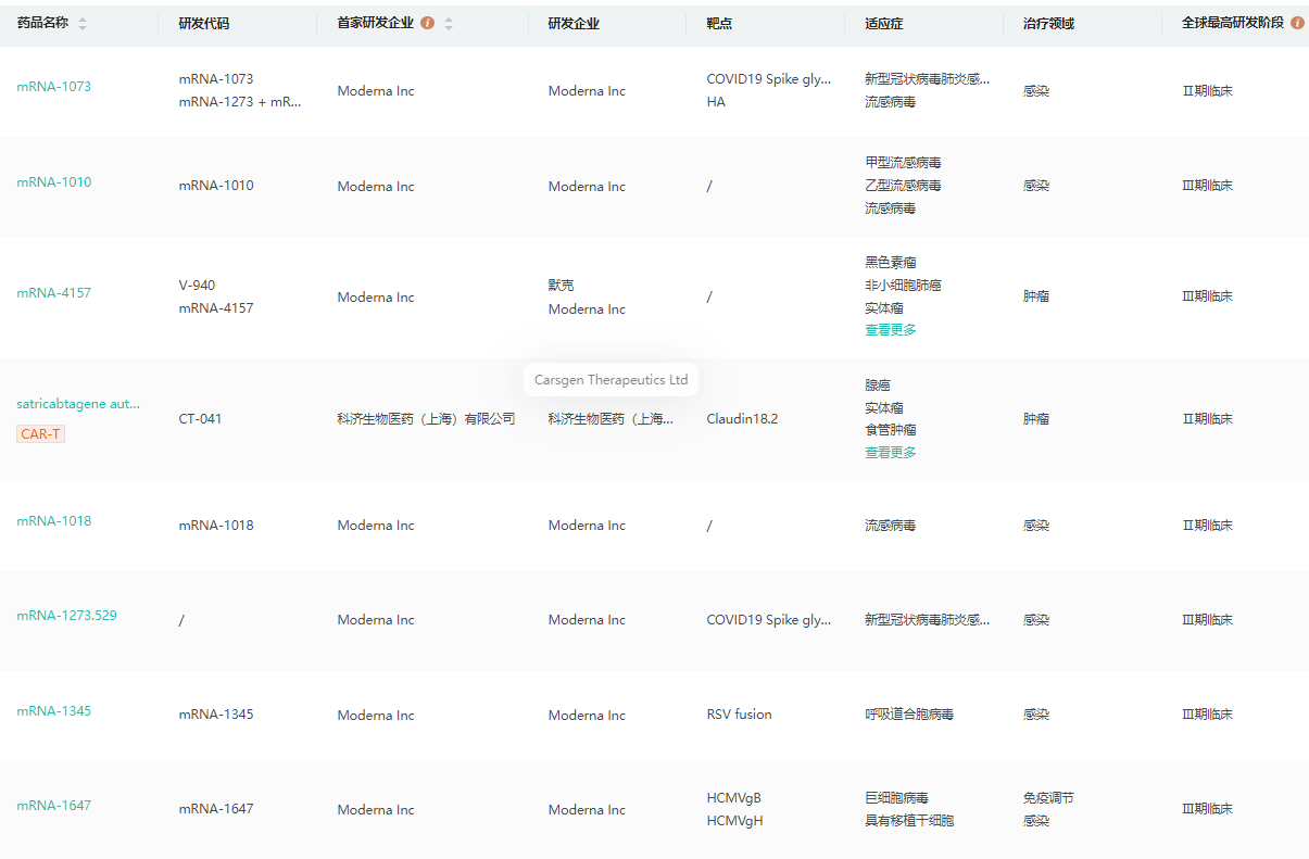 除呼吸道疾病领域外,Moderna在潜伏性和其他病毒领域、肿瘤领域和罕见病领域都有更新。