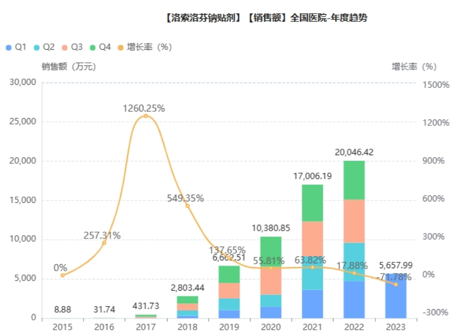 2015年,洛索洛芬钠贴剂50mg获批在中国上市(商品名:乐松),2022nm 10月,100mg新规格上市;2022年12月,洛索洛芬钠贴剂中选《江苏省第三轮药品集中带量采购》。据药融云数据库,2022年洛索洛芬钠贴剂院内销售额突破2亿元,同比增长18%。