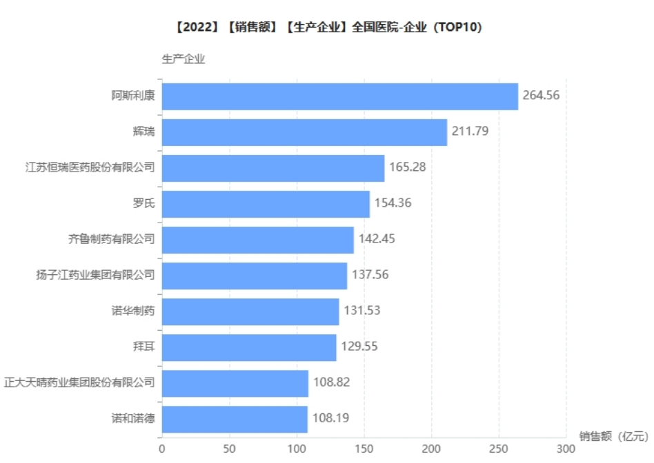 据药融云数据库,2022年院内市场销售额TOP10企业中,本土药企仅占据4席,分别为江苏恒瑞、齐鲁制药、扬子江药业和正大天晴药业;其余6家企业均为外企,分别为阿斯利康、罗氏、诺华制药、拜耳、辉瑞以及诺和诺德。