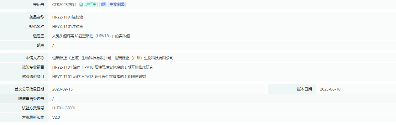 9月15日,据药融云数据显示:恒瑞源正用于治疗HPV18阳性实体瘤的HRYZ-T101注射液启动一期临床。