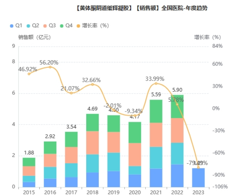 黄体酮阴道缓释凝胶原研来自德国默克,可以通过靶向给药,改善子宫内膜容受性,促进胚胎着床并减少流产风险,用于辅助生育技术中黄体酮的补充治疗。2008年,黄体酮阴道缓释凝胶8%获批进入中国(商品名:Crinone,雪诺同),目前尚未进入医保,不过其销售额一直在快速增长。据药融云数据库,该品种2022年院内销售额已近6亿元。