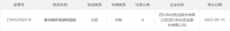 据CDE官网最新公示,四川科伦递交的4类仿制化药黄体酮阴道缓释凝胶上市申请获受理。目前,该品种由原研独家在售,尚无国产仿制药获批,科伦有望争夺首仿。