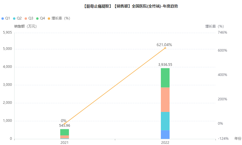 2020年12月,筋骨止痛凝胶通过医保谈判纳入国家医保目录。药融云全国医院销售(全终端)数据库显示,2022年医院终端市场筋骨止痛凝胶的销售额接近4000万元,同比增长621.04%。