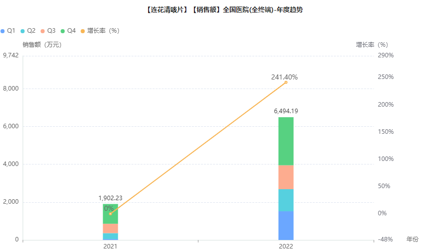 长期以来,以岭药业重点布局中医药板块,拥有莲花清瘟胶囊/颗粒、通心络胶囊、参松养心胶囊等明星单品。药融云数据库显示,2022年在医院终端市场以岭药业的连花清咳片销售额为6494.19万元,同比增长241.4%。