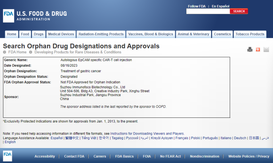 9月17日,易慕峰,一家致力于突破实体瘤治疗的细胞治疗产品开发企业,宣布其自主研发的靶向EpCAM的自体CAR-T细胞注射液产品(IMC001)近期获得美国食品和药物管理局(FDA)的孤儿药资格认定(ODD),用于治疗胃癌患者。