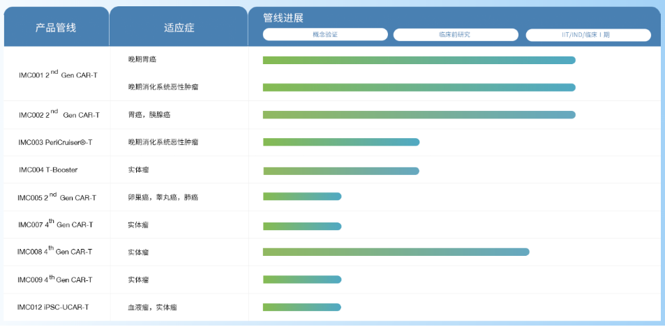 IMC001是靶向EpCAM的自体CAR-T产品。EpCAM是循环肿瘤细胞(CTC)的生物标志物,它在消化系统肿瘤的转移灶和原位灶中均表达高,而在正常组织中表达量较低;EpCAM在正常组织中表达在免疫细胞不易接触到的细胞基底侧面,而在肿瘤恶性转化过程中EpCAM表达模式转变为在细胞膜上均匀分布。基于EpCAM在正常组织和肿瘤组织间表达量和表达模式的差异,IMC001能够区分肿瘤组织和正常组织,具有良好的剂量窗口,且在临床前研究中显示出极具潜力的抗肿瘤活性。