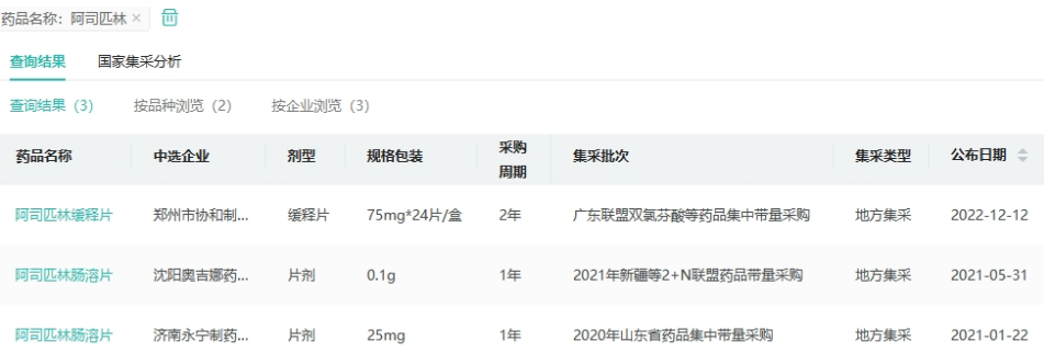 另一方面,目前尚无阿司匹林被纳入集采,仅有济南永宁制药的阿司匹林肠溶片、沈阳奥吉娜药业的阿司匹林肠溶片和郑州协和制药厂的阿司匹林缓释片曾于地方集采中中选。
