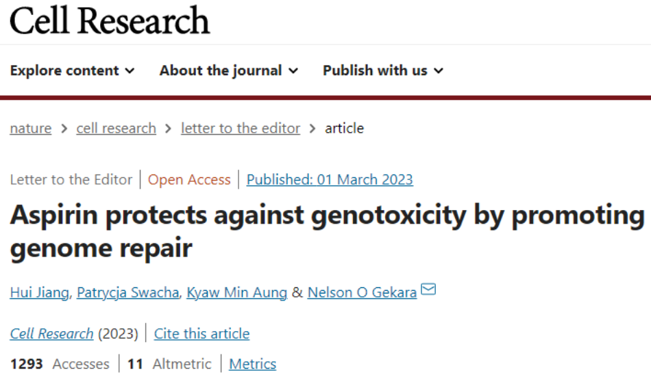 今年3月,一项发表在Cell Research上的题为“Aspirin protects against genotoxicity by promoting genome repair”的研究表明,除了抗炎作用之外,阿司匹林还是HR介导的DNA修复的有效放大器。阿司匹林抑制炎症通路和通过HR促进DSB修复的能力强调了其在炎症和基因组不稳定驱动的健康问题管理中的潜力。此外,阿司匹林是染色质结构和修复调节剂的发现提供了一种新机制,可以解释其许多广受赞誉的健康益处。