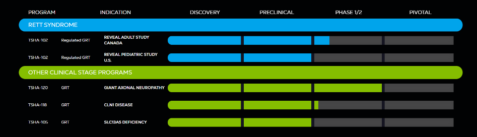 TSHA-120是一种鞘内递送的AAV9基因替代疗法,用于为GAN患者递送巨轴突蛋白基因。TSHA-102利用一种新型的miRARE平台,旨在介导CNS中每个细胞的MECP2水平,而不会有过表达的风险。TSHA-102已获得FDA的孤儿药和罕见儿科疾病指定,并已获得欧盟委员会的孤儿药指定。