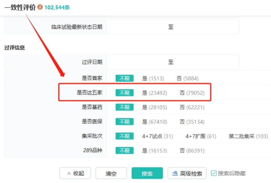 ✔新增“是否达五家”筛选项,方便您快速筛选符合相应条件的过评品种信息。此外,您还可以通过输入药品名称、企业名称、批准文号、申报受理号等关键词,选择办理状态、审评结论、集采批次等筛选条件进行精准查询,是您分析一致性评价数据,预测市场竞争格局的高效工具。
