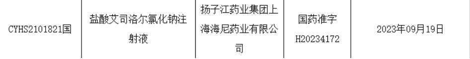 据NMPA官网显示,扬子江药业的4类仿制化药盐酸艾司洛尔氯化钠注射液获得批准上市。