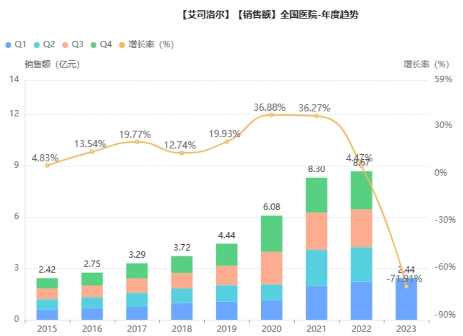 目前国内已获批上市的产品有盐酸艾司洛尔注射液、注射用盐酸艾司洛尔和盐酸艾司洛尔氯化钠注射液,三个剂型均已被纳入2022年国家医保目录(乙类)。2022年艾司洛尔院内销售额为8.6亿元,以盐酸艾司洛尔注射液为主力品种,企业方面则是齐鲁制药市场份额最高(93.7%)。