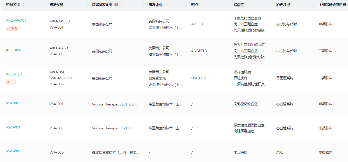 维亚臻是一家立足于中国、放眼全球的小核酸药物治疗公司,旨在打造具备研发、生产和商业化全面能力的生物医药企业。公司成立于2022年,并与国际领先的小核酸药物企业Arrowhead Pharmaceuticals(NASDAQ:ARWR)建立长期战略合作关系。目前公司产品管线拥有三款处于临床研发阶段、针对心血管及代谢疾病领域的小核酸(siRNA)药物。公司现有管线在同类竞品中处于领先位置,其在研靶点具有明确基因组学及生物学证据支持,并使用Arrowhead Pharmaceuticals已经验证的化学修饰及递送技术平台。