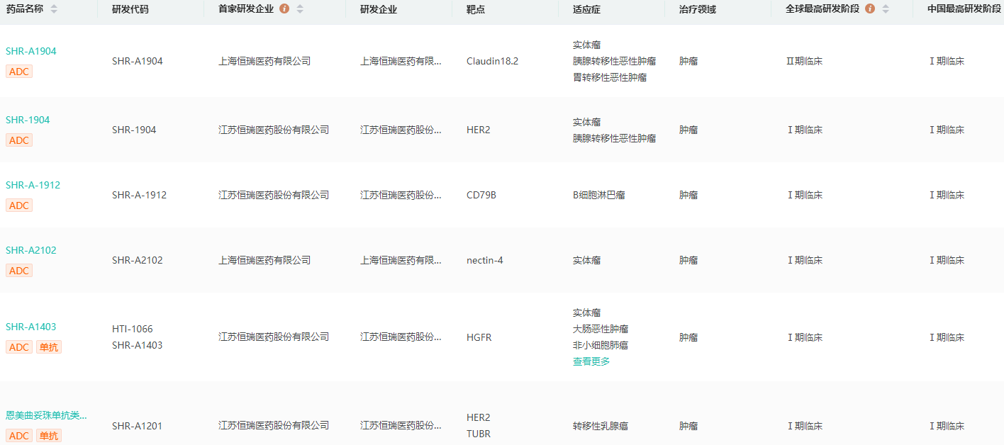 恒瑞医药ADC管线布局查询(部分)