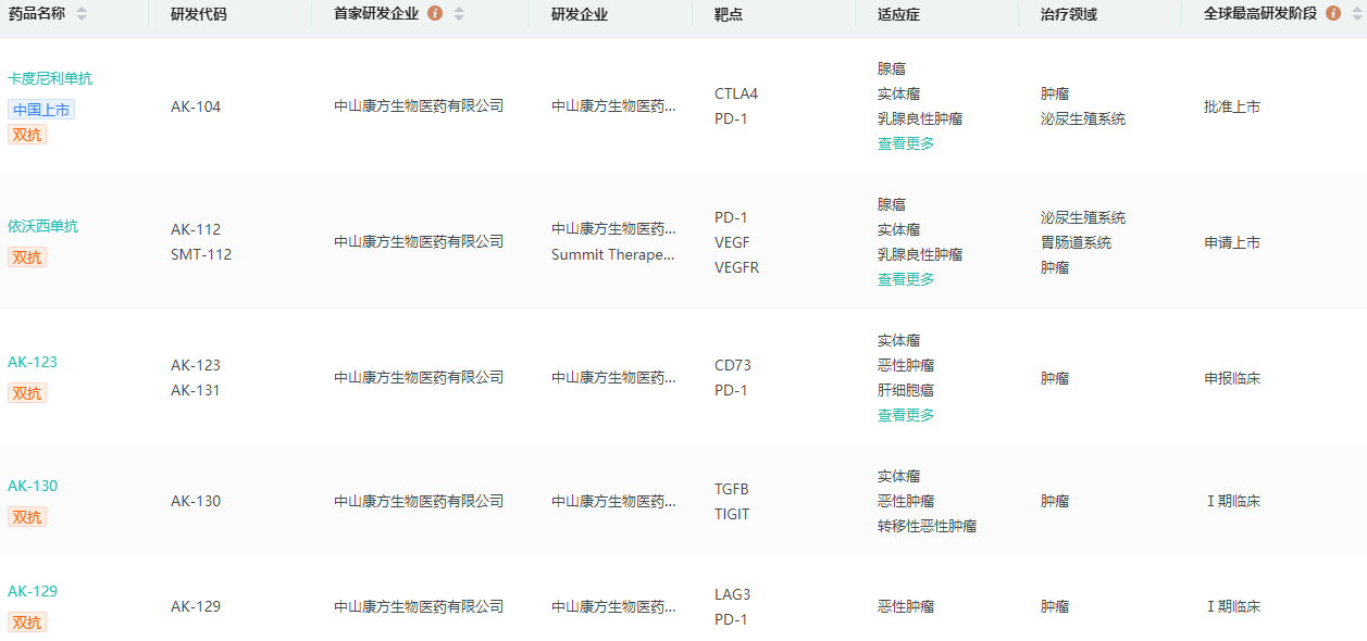 药融云数据库显示,这是康方生物的第6个双抗IND,此前已有的双抗产品包括已上市的PD-1/CTLA-4双抗卡度尼利,以及已提交上市申请的PD-1/VEGF双抗依沃西,PD-1/LAG-3双抗AK129,全球唯一且在研的TIGIT/TGF-β双功能融合蛋白AK130、PD-1/CD73双抗AK131、Claudin18.2/CD47双抗AK132等全球领先双抗均已进入临床。