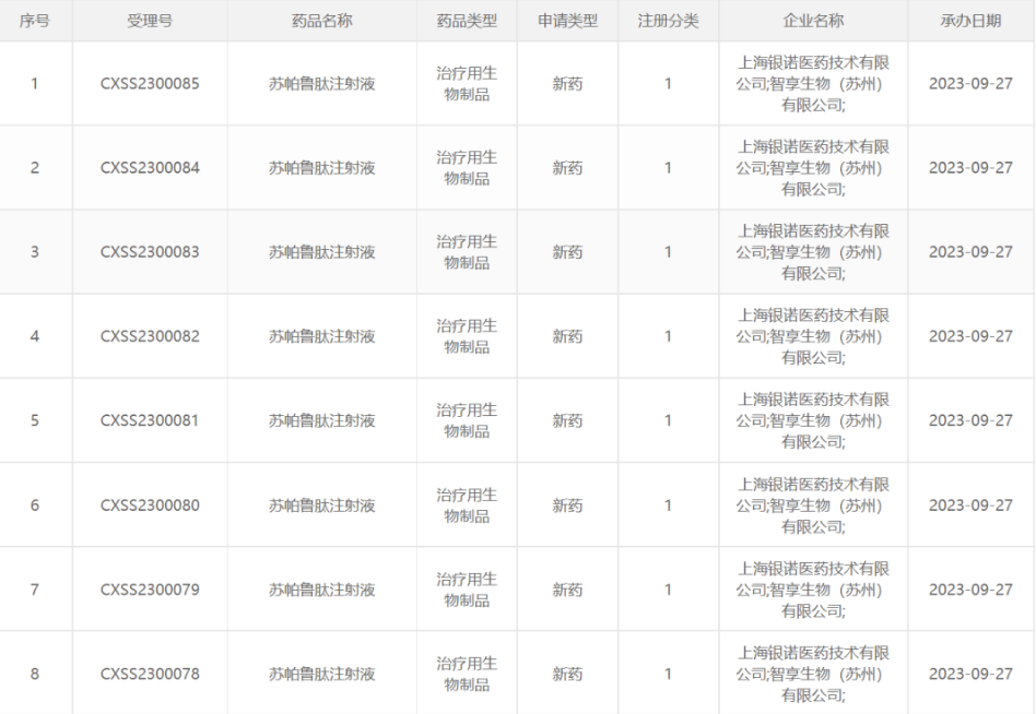 9月27日,银诺医药1类新药苏帕鲁肽注射液的8项上市申请获得NMPA受理,适应症为苏帕鲁肽单药治疗在饮食和运动干预后血糖控制不佳的2型糖尿病患者以及联合治疗二甲双胍治疗后血糖控制不佳的2型糖尿病患者。这是银诺医药的首发管线。