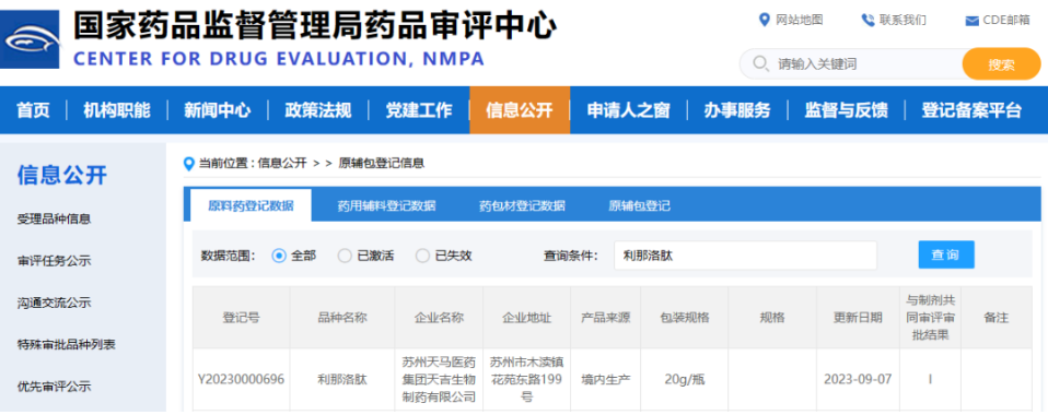 2023年9月,苏州天马医药集团天吉生物制药有限公司的利那洛肽原料药和制剂均获国家药品监督管理局受理,这标志着天吉生物积极布局新兴药物市场、持续深耕多肽药物领域的又一里程碑事件。
