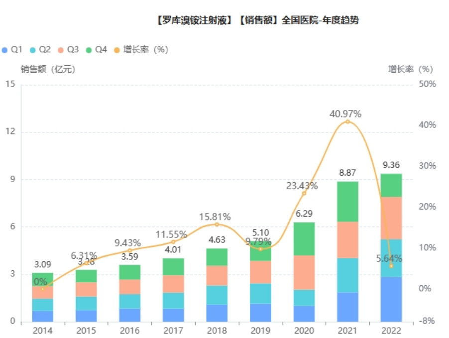 2003年11月,罗库溴铵经获准进入中国市场。近年来,随着我国医疗机构住院人数及手术台数持续增加,罗库溴铵国内市场持续扩容。根据药融云全国医院销售数据显示,罗库溴铵注射液在大医院2022年销售额高达9.36亿元,医院全终端销售额超过11亿元。