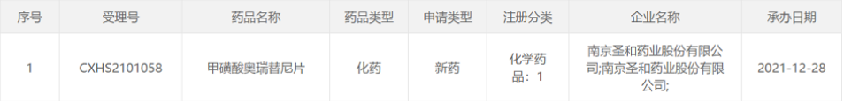 2021年12月28日,CDE官网显示,南京圣和药业1类新药甲磺酸奥瑞替尼片上市申请获NMPA受理。