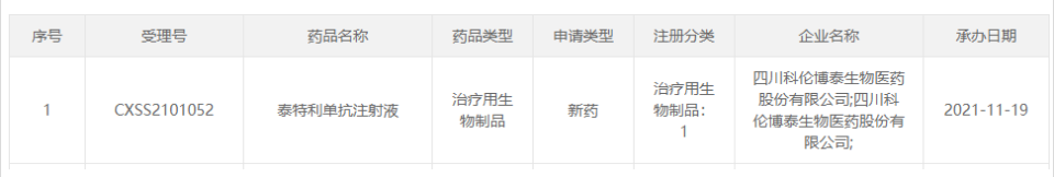 2021年11月19日,科伦药业1类新药泰特利单抗上市申请获受理。这是一款PD-L1单抗,本次申报的适应症为:既往接受过二线及以上化疗失败的复发或转移性鼻咽癌。