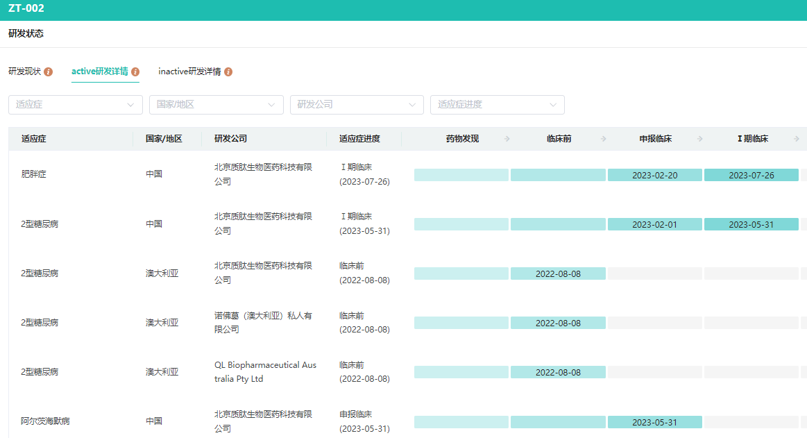 ZT002是基于质肽生物多肽长效技术平台(QLLong)开发的新型超长效GLP-1受体激动剂,主要治疗糖尿病和肥胖症。已在澳洲完成一期临床研究,并于2023年上半年获批在国内开展糖尿病和减重两项适应症的临床试验。