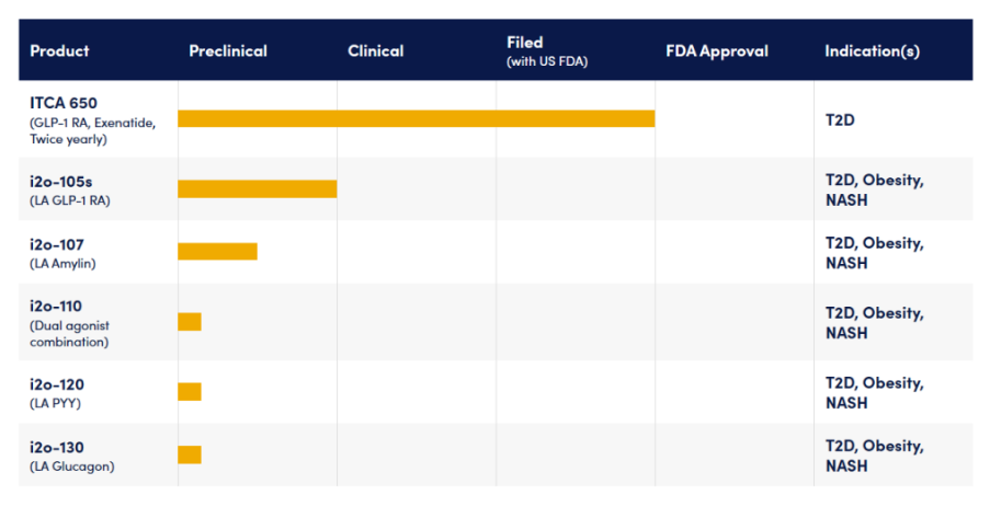 i2o从Intarcia Therapeutics 收购的心脏代谢临床管线有六个候选药物,包括曾两次被FDA拒绝的用于治疗2型糖尿病的药物ITCA 650。