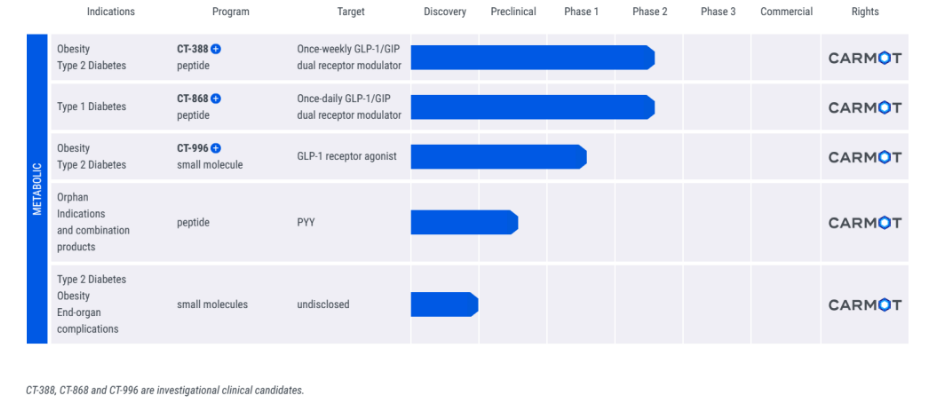 该公司另一个项目是GLP-1/GIP双受体调节剂CT-868,正在进行两项临床试验:一项1期试验评估其对1型糖尿病受试者血糖调节的影响,以及一项2期试验则评估该疗法对超重或肥胖且患有2型糖尿病患者血糖水平的作用。