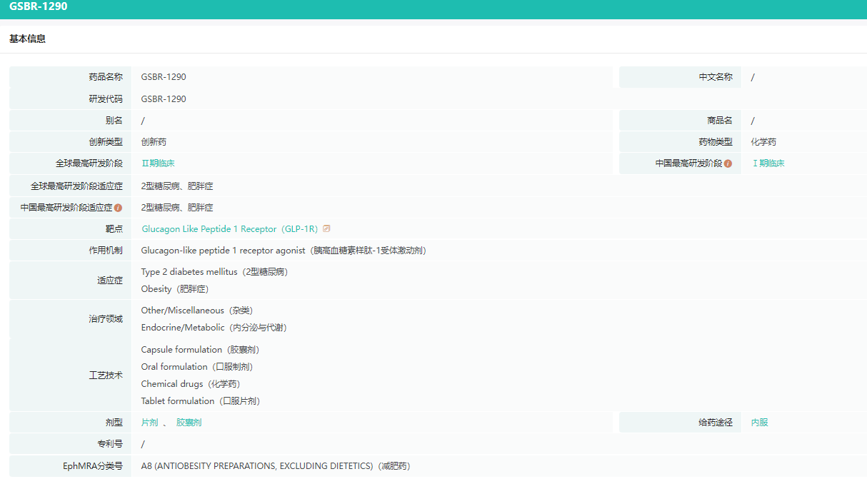 GSBR-1290是一种口服的小分子GLP-1受体(GLP-1R)激动剂,正在开发用于治疗2型糖尿病和肥胖患者。此前,GSBR-1290已于2022年9月完成了1期单次递增剂量研究,于2023年1月启动了1b期多次递增剂量研究,并在2023年5月25日,宣布启动GSBR-1290治疗2型糖尿病和肥胖症的2a期研究,初步结果预计将于2023年第四季度后半期公布。此外,该公司已经启动了一个第一阶段的民族桥接研究,以评估单剂量和多剂量的GSBR-1290在日本患者中的安全性、耐受性和PK。