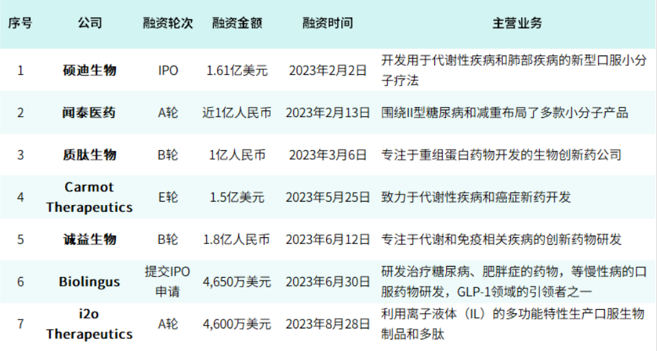 近年来,胰高血糖素样肽-1(GLP-1)受体激动剂类药物由于其降糖减重效果明确,成为了药物开发的一个热点方向。并且GLP-1的吸金能力强大,截至2023年9月,国内外共发生7起GLP-1领域的融资事件,融资金额总计高达4.6亿美元。