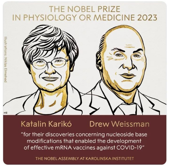 10月2日下午,瑞典卡罗琳医学院宣布,将2023年诺贝尔生理学或医学奖授予卡塔琳·考里科(Katalin Karikó)和德鲁·韦斯曼(Drew Weissman),以表彰他们在信使核糖核酸(mRNA)研究上发现了核苷碱基修饰,这让抗COVID-19 mRNA疫苗的研发达到前所未有的速度。