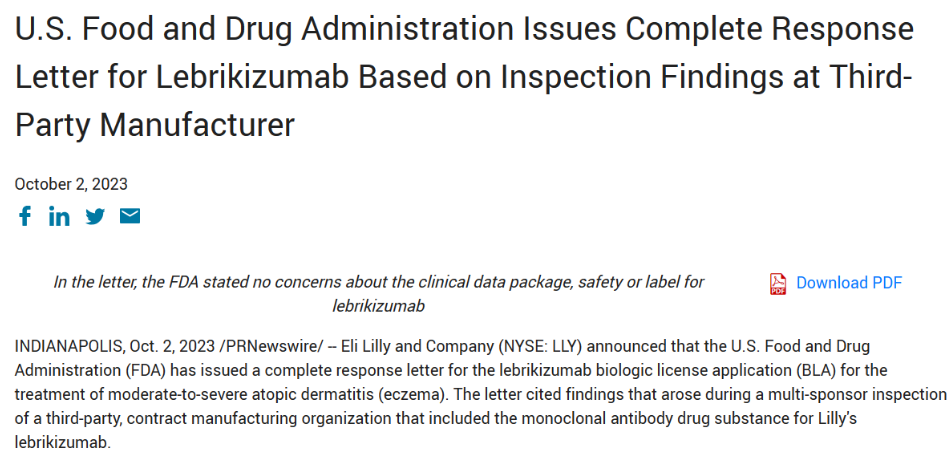 [2]https://endpts.com/FDA-rejects-eli-lillys-eczema-drug-lebrikizumab-due-to-third-party-manufacturing-issues/