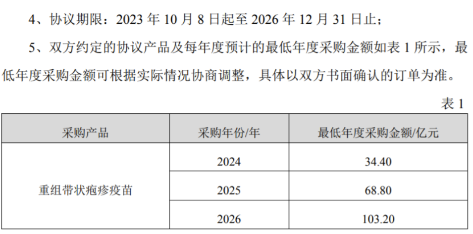 2023年10月8日,智飞生物与GSK签署了《独家经销与联合推广协议》,双方就GSK研发生产的欣安立适®(重组带状疱疹疫苗)开展深度合作。根据协议,GSK将向智飞生物独家供应欣安立适®(重组带状疱疹疫苗),并许可智飞生物在中国大陆地区(不包括港澳台)营销、推广、进口并经销该产品。