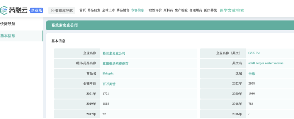 据药融云数据库显示:2022年GSK的带状疱疹疫苗Shingrix全球销售额29.58亿英镑,同比增长72%,是公司的旗舰产品;其中本品在德国和中国市场均实现翻倍增长。