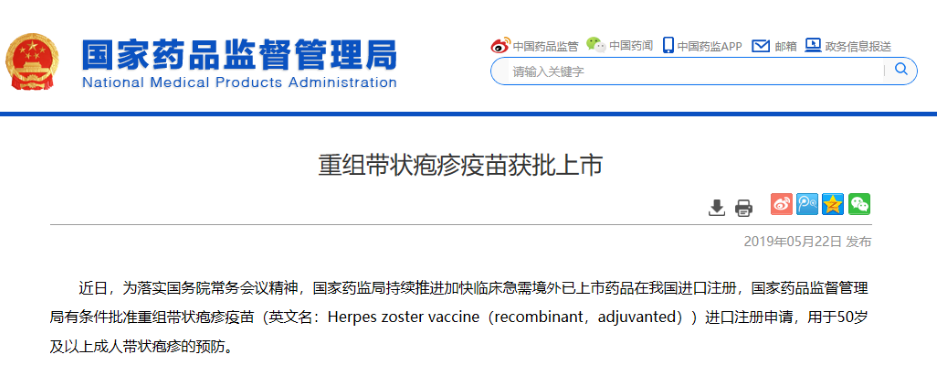 2019年5月,葛兰素史克(GSK)欣安立适(Shingrix)(重组带状疱疹疫苗)获得中国国家药品监督管理局(NMPA)批准,用于50岁及以上成人预防带状疱疹。2020年中,正式在中国市场开售。