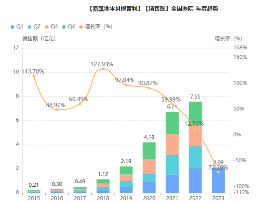 氨氯地平贝那普利是治疗高血压的复方制剂,目前国内市场已有片剂(来自扬子江、成都地奥制药)和胶囊获批上市。2022年,氨氯地平贝那普利片院内销售额超7.5亿元,同比增长13%,其中扬子江市场份额过半,占据一定优势。