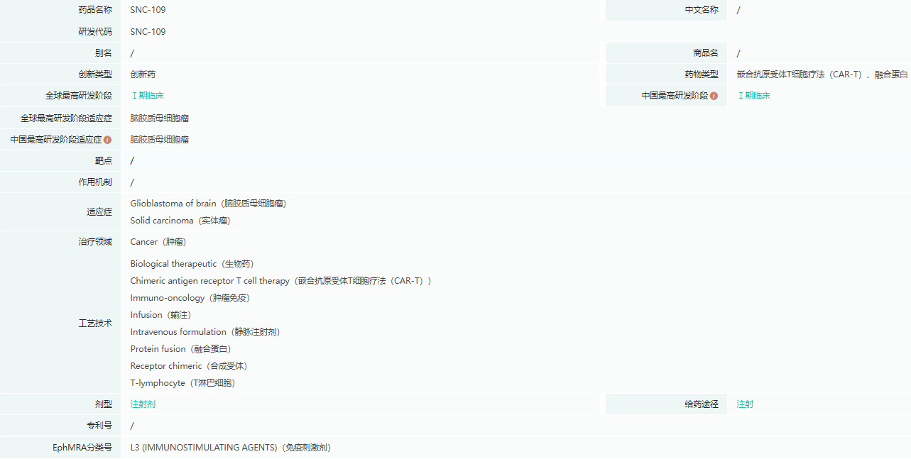 SNC-109注射液是一款特异性针对胶质母细胞瘤的CAR-T细胞,为双臂BiTE装甲的双CAR-T细胞。CAR-T细胞表面特异性表达靶向IL13R⍺2及HER2嵌合抗原受体(CAR),并可分泌靶向EGFR和EGFRVIII的双特异T细胞抗体(bispecific T-cell engager,BiTE)。
