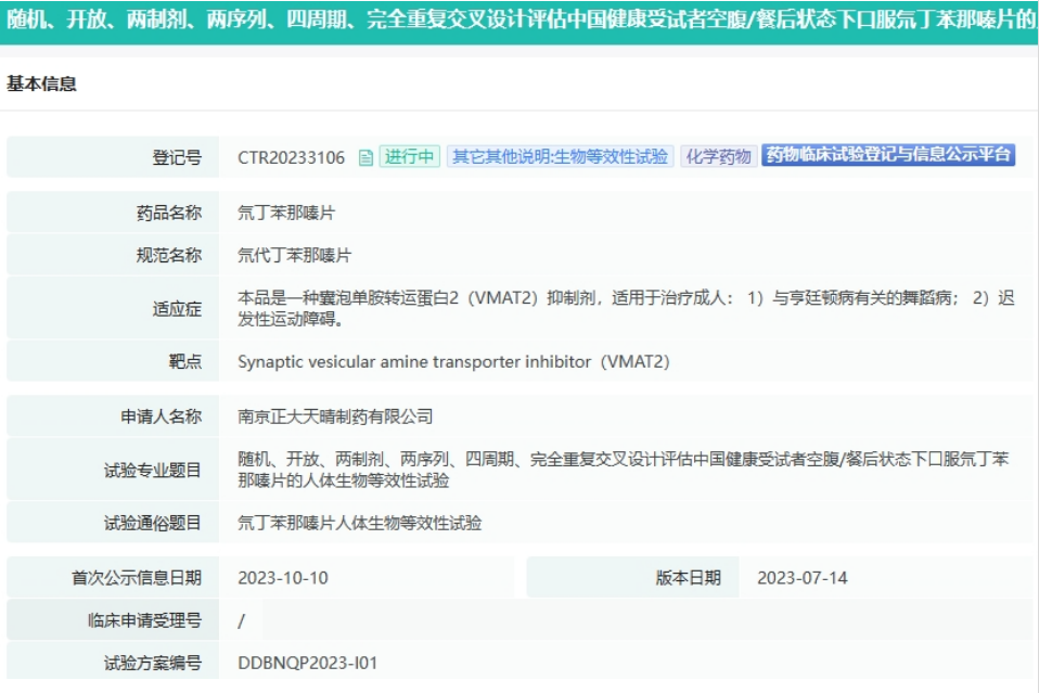 亨廷顿病是一种罕见的致命的神经退化性疾病,亚洲每十万人中大约有0.4人患病,平均发病年龄为40岁。亨廷顿舞蹈症(Huntington’s Disease)是一种罕见的常染色体显性遗传病,目前无有效治疗手段。具体作用机制不详,但被认为与它可逆的单胺耗竭作用有关。