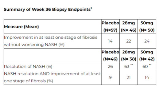 结果显示,22 % ( 28mg EFX )和24 % ( 50mg EFX )的患者在36周时肝纤维化至少有一个阶段的改善,而NASH没有恶化,而安慰剂组为14 %,不具有统计学意义 。
