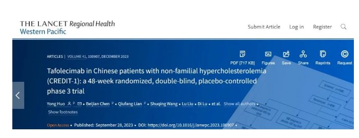2023年10月,托莱西单抗注射液在中国非家族性高胆固醇血症(non-FH)受试者中的III期临床研究(研究代号:CREDIT-1)结果在国际期刊柳叶刀子刊The Lancet Regional Health-Western Pacific在线发表,本文第一作者和通讯作者为北京大学第一医院霍勇教授。